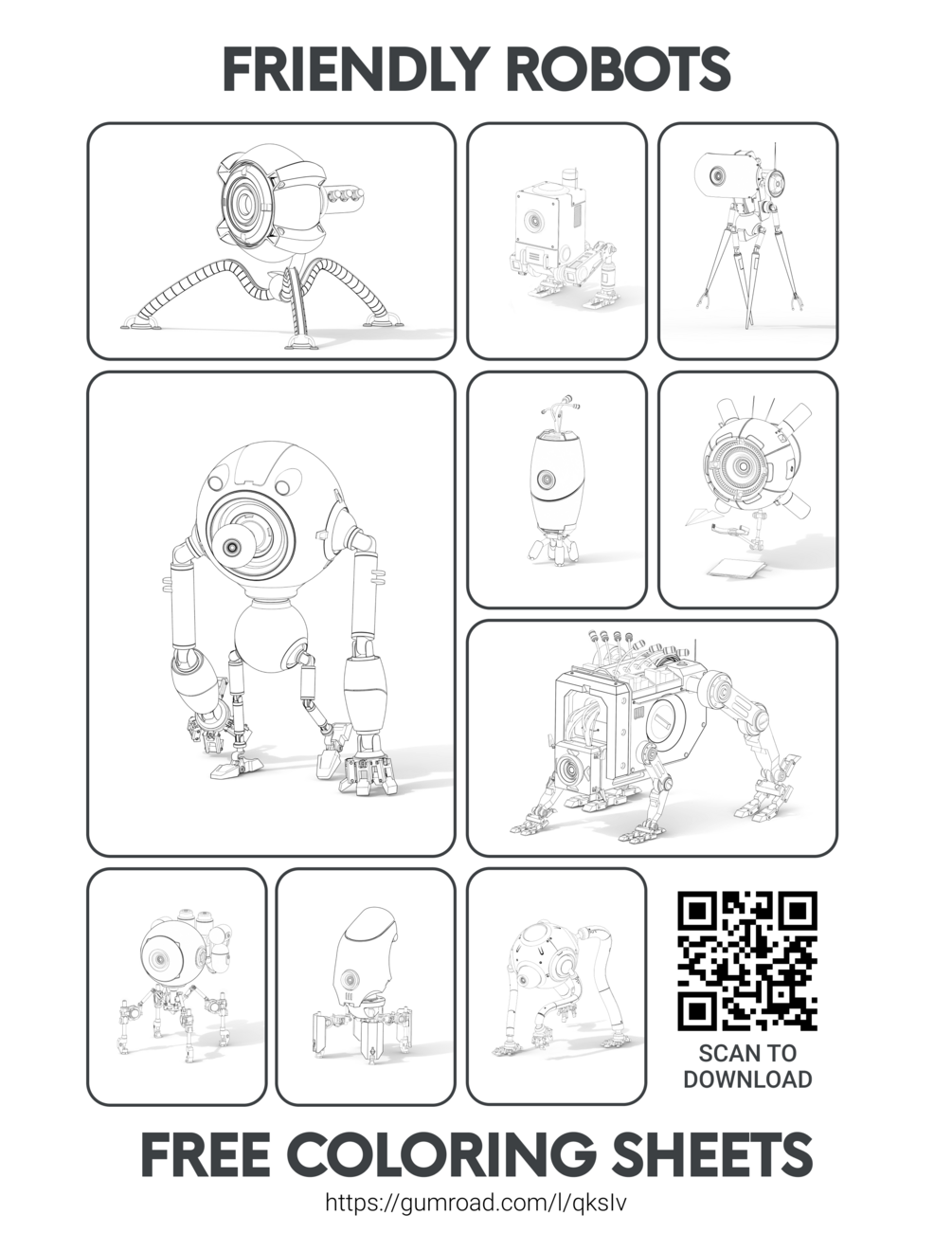 I’ve included a combined PDF for easy printing and a folder with the individual sheets for those who want to take a digital approach. Currently featuring 10 robots.